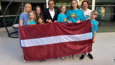 Delegācija ar Latvijas karogiem festivālā