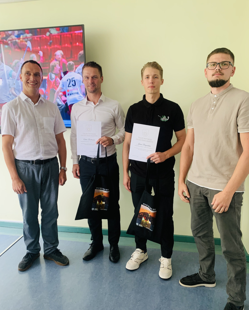 Ar augstiem sasniegumiem no Pasaules spēlēm, kas notika Ķīnā no 7. līdz 17. augustam, atgriezusies Latvijas sportistu delegācija. Viņu vidū arī Talsu novada pārstāvji. Lai izteiktu pateicību par ieguldījumu sporta attīstībā, un Talsu novada tēla popularizēšanu pasaulē, un godinātu mūsu novadniekus, 19. augustā tika rīkota pieņemšana pie Talsu novada domes priekšsēdētāja Anša Bērziņa. Pateicības saņēma Latvijas izlases dalībnieki disku golfā – Elizabete Pēkšena un Rainers Balodis, kā arī Latvijas vīriešu izlases florbolā četri Talsu sportisti – Artis Raitums, Jānis Ragovskis, Toms Akmeņlauks un Sandijs Gabriels Siliņš. Toms, diemžēl, slimības dēļ nevarēja ierasties, un arī Sandijs jau bija devies uz Somiju. Tikšanās notika pozitīvā gaisotnē, uzklausot spēļu dalībnieku stāstus par piedzīvoto Ķīnā. Sportisti atzina, ka ļoti vērtīgs bijis savstarpējais atbalsts, un florbola puiši pat devās līdzi disku golfa trasē, lai ar dziesmām un uzmundrinājumiem atbalstītu mūsu jauniešus, un smaidot piebilda, ka ir jauki aizbraukt uz Ķīnu, lai talsenieki savstarpēji iepazītos un sadraudzētos.
