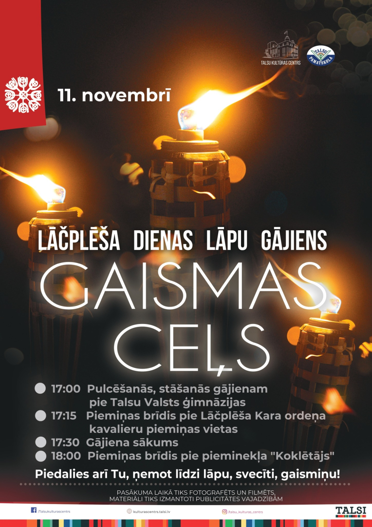 Talsu novada pašvaldība aicina iedzīvotājus 11. novembrī piedalīties Lāčplēša dienas lāpu gājienā „Gaismas ceļš” un piemiņas brīdī, godinot Latvijas brīvības cīnītājus.