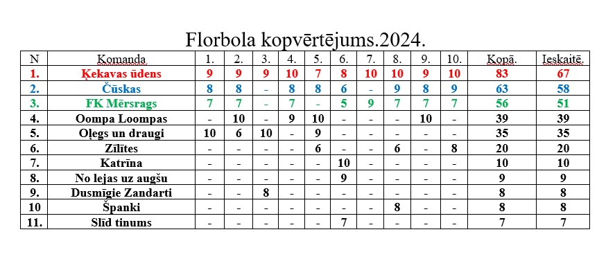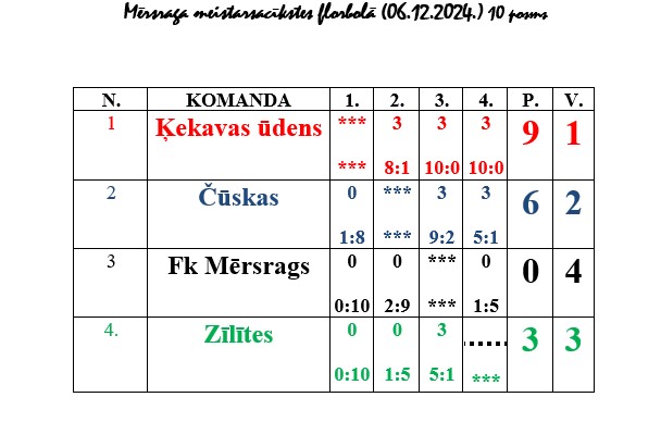 6. decembrī Mērsraga sporta zālē notika Mērsraga meistarsacīkšu florbolā 10. posms. Pirmajā vietā un 10. posma uzvarētāji – komanda „Ķekavas ūdens” (Ritvars Upesjozups, Eduards Kļaviņš, Dāvis Janbergs un Kristians Dakstiņš).