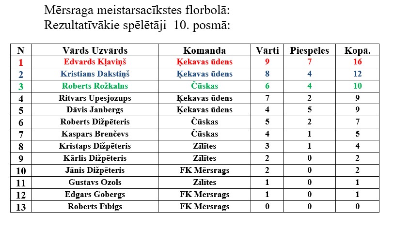 Desmitajā posmā rezultatīvākais spēlētājs bija Edvards Kļaviņš no komandas „Ķekavas ūdens”, viņam 16 punkti – 9 vārti un 7 piespēles.