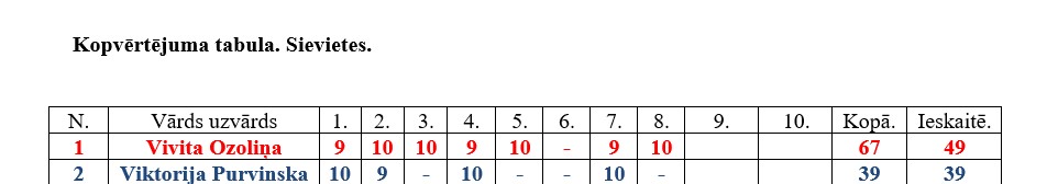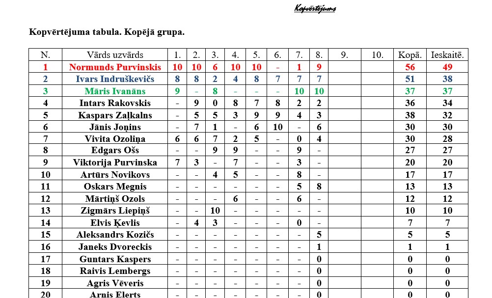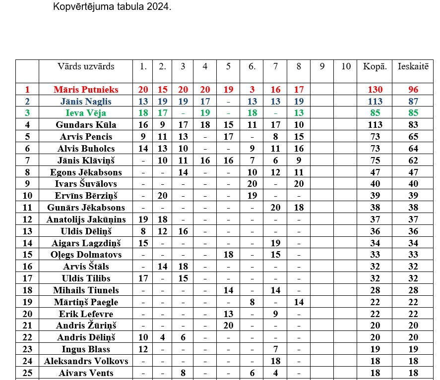 Kopvērtējumā kopējā grupā pirmais Normunds Purvinskis ar 49 punktiem, otrais Ivars Indruškevičs ar 38 punktiem, bet trešajā vietā Māris Ivanāns ar 37 punktiem. Dāmu konkurencē ar 49 punktiem pirmajā vietā Vivita Ozoliņa, bet otrajā vietā ar 39 punktiem Viktorija Purvinska.