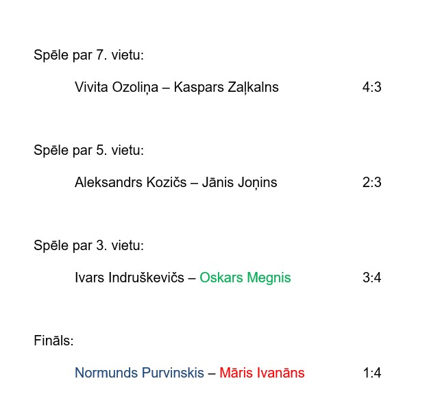 Pusfinālā savā starpā tikās Ivars Indruškevičs un Normunds Purvinskis, bet otrajā pārī Māris Ivanāns pret Oskaru Megni. Veiksmīgāki un meistarīgāki izrādījās Normunds un Māris, kas finālā noskaidroja uzvarētāju, bet cīņā par trešo vietu sacentās Oskars pret Ivaru.