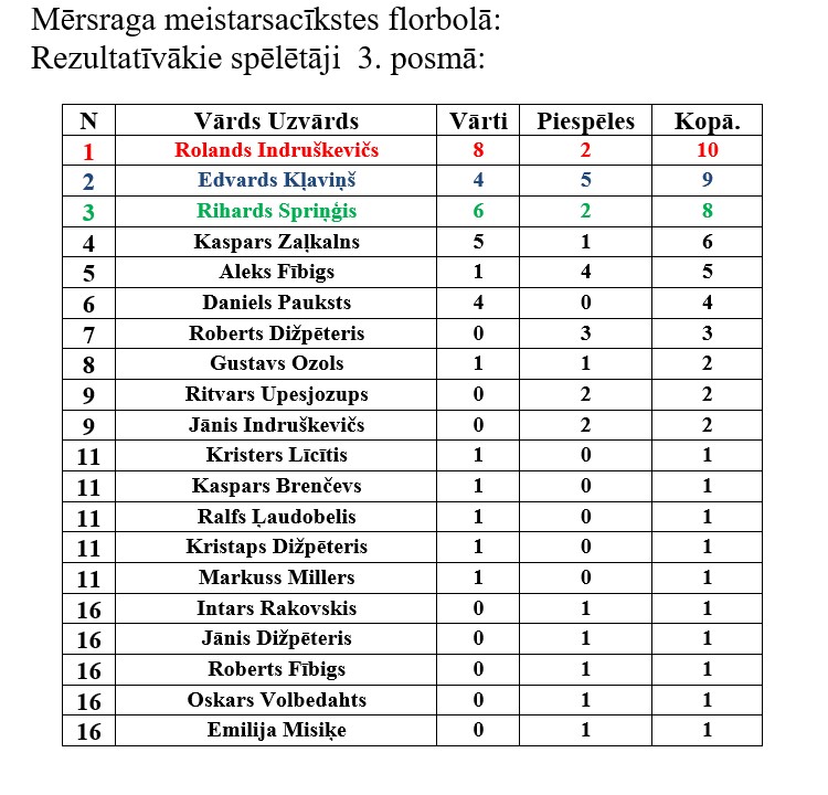 Trešajā posmā rezultatīvākais spēlētājs bija Rolands Indruškevičs, viņam 10 punkti – astoņi vārti un divas piespēles.