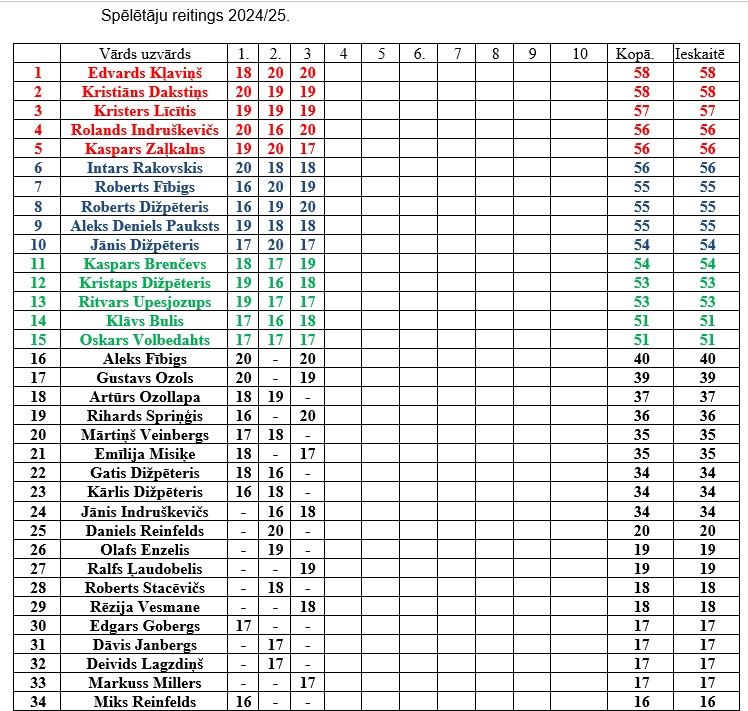 Kopvērtējuma reitingā pirmie pieci spēlētāji pēc trīs posmiem ir Edvards Kļaviņš, Kristiāns Dakstiņš, Kristers Līcītis, Rolands Indruškevičs un Kaspars Zaļkalns.