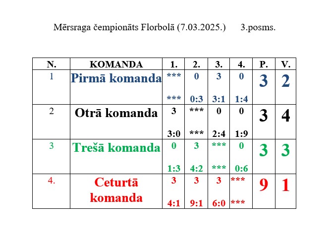 7. martā Mērsraga sporta zālē notika Mērsraga meistarsacīkšu florbolā 3. posms. Komandas tika izveidotas, vadoties pēc spēlētāju reitinga. Pirmajā vietā un 3. posma uzvarētāji – Ceturtā komanda (Edvards Kļaviņš, Rolands Indruškevičs, Roberts Dižpēteris, Aleks Fībigs un Rihards Spriņģis).