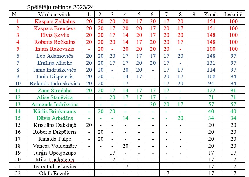 Pēc astoņiem posmiem spēlētāju reitingā pirmie pieci ir Kaspars Zaļkalns, Kaspars Jānis Brenčevs, Elvis Ķevlis, Roberts Rožkalns un Intars Rakovskis.