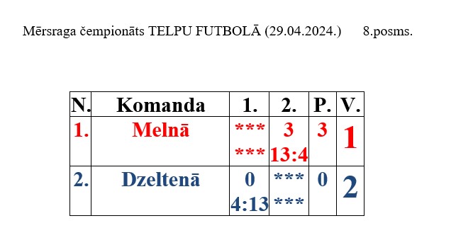 29. aprīlī Mērsraga sporta zālē notika Mērsraga meistarsacīkšu futbolā 8. posms. Turnīrā no desmit spēlētājiem tika izveidotas divas komandas, kas sacentās viena pret otru. Astotajā posmā uzvaru svinēja „Melnā” komanda, otrajā vietā „Dzeltenā” komanda.