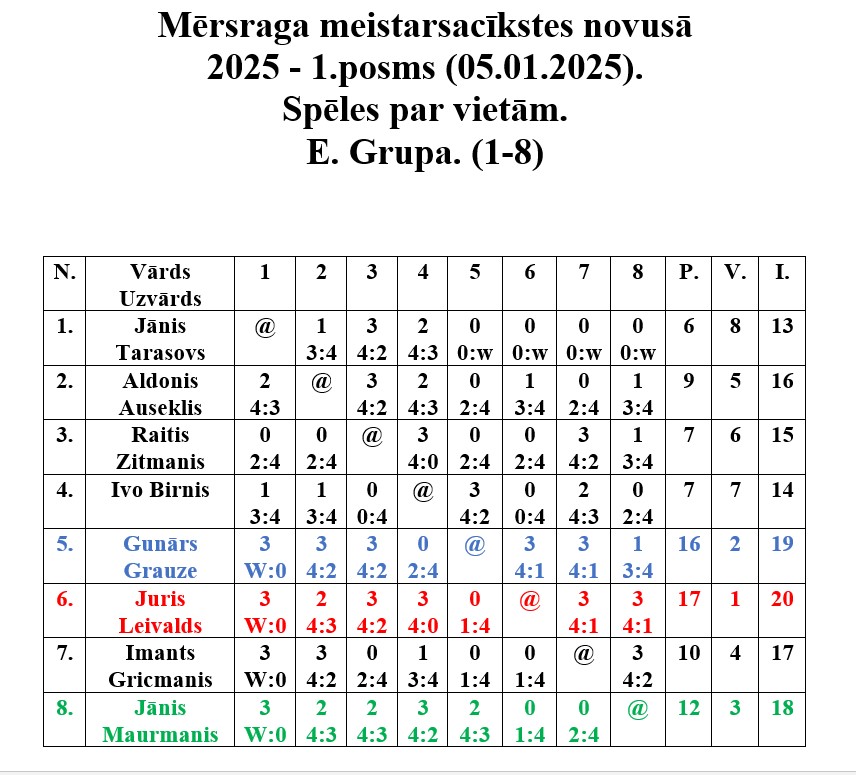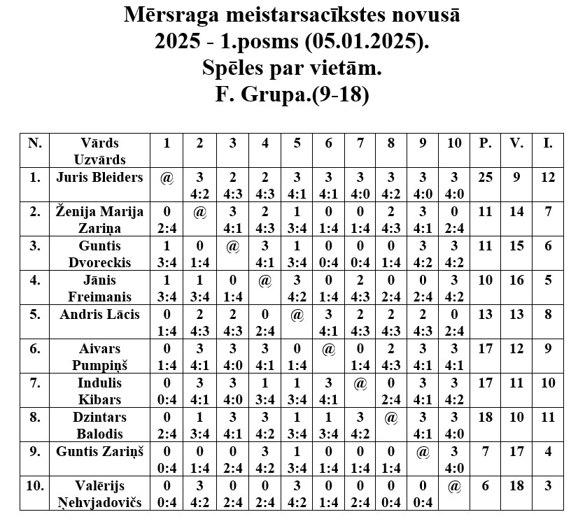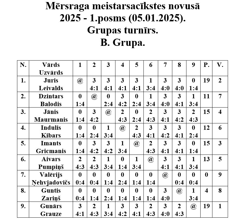 5. janvārī Mērsraga tautas namā notika Mērsraga meistarsacīkšu pirmais posms novusā. Astoņpadsmit dalībnieki pēc reitinga tika sakārtoti divās grupās. Pēc grupas spēlēm notika spēles par vietām, noskaidrojot visu vietu ieguvējus. Pēc saspringtām un interesantām cīņām pirmā posma uzvarētājs ir Juris Leivalds, otrajā vietā Gunārs Grauze, bet trešais Jānis Maurmanis.