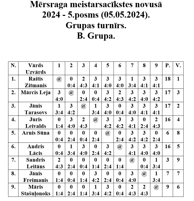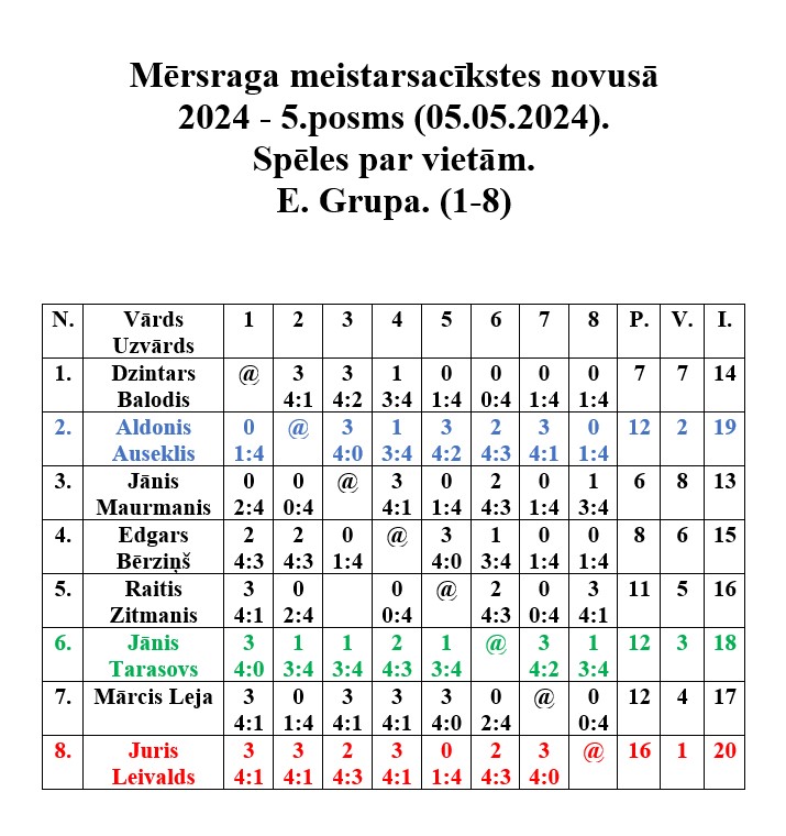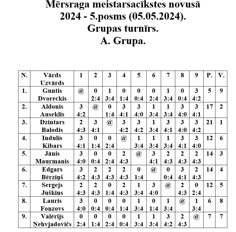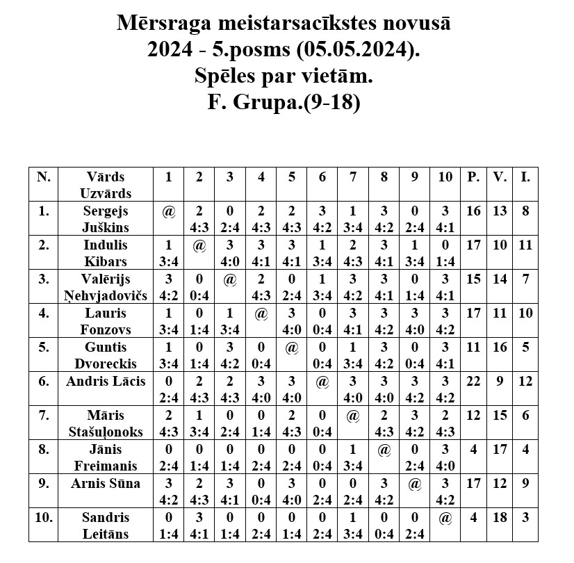 5. maijā Mērsraga tautas namā notika Mērsraga meistarsacīkšu novusā piektais posms. Dalību piektajā posmā pieteica astoņpadsmit dalībnieki, no kuriem tika izveidotas divas grupas. Pēc grupas spēlēm notika spēles par vietām, kurās tika noskaidroti visu vietu ieguvēji. Pēc saspringtām un interesantām cīņām piektā posma uzvarētājs ir Juris Leivalds, otrajā vietā Aldonis Auseklis, bet trešais Jānis Tarasovs.