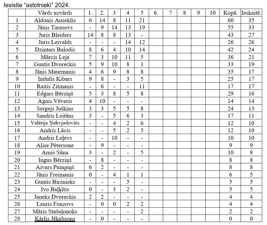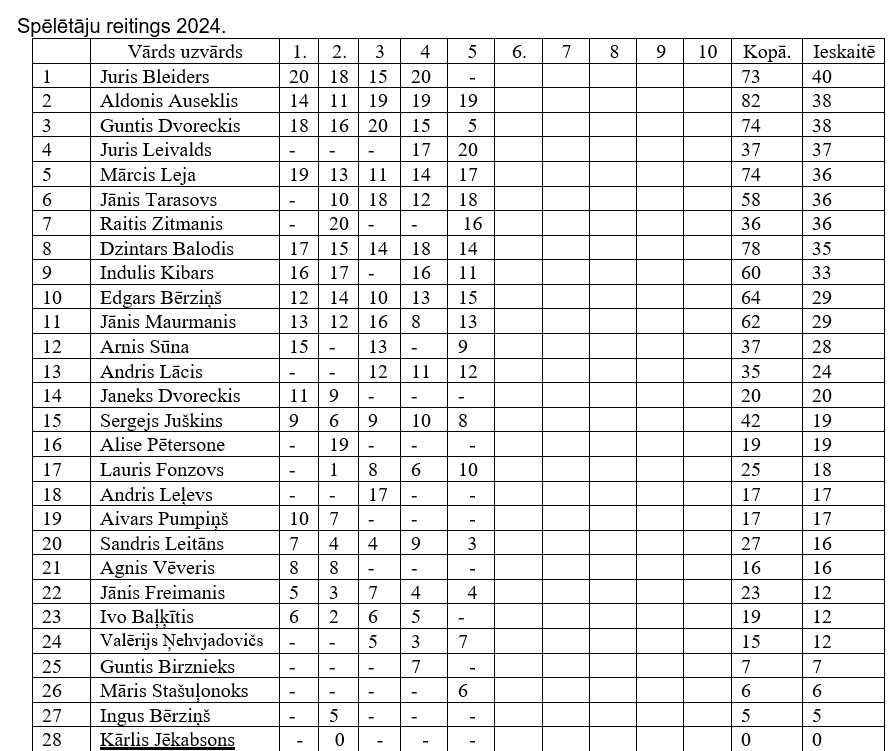 Kopvērtējumā pēc pieciem posmiem pirmais Juris Bleiders, otrais Aldonis Auseklis, bet trešais Guntis Dvoreckis.