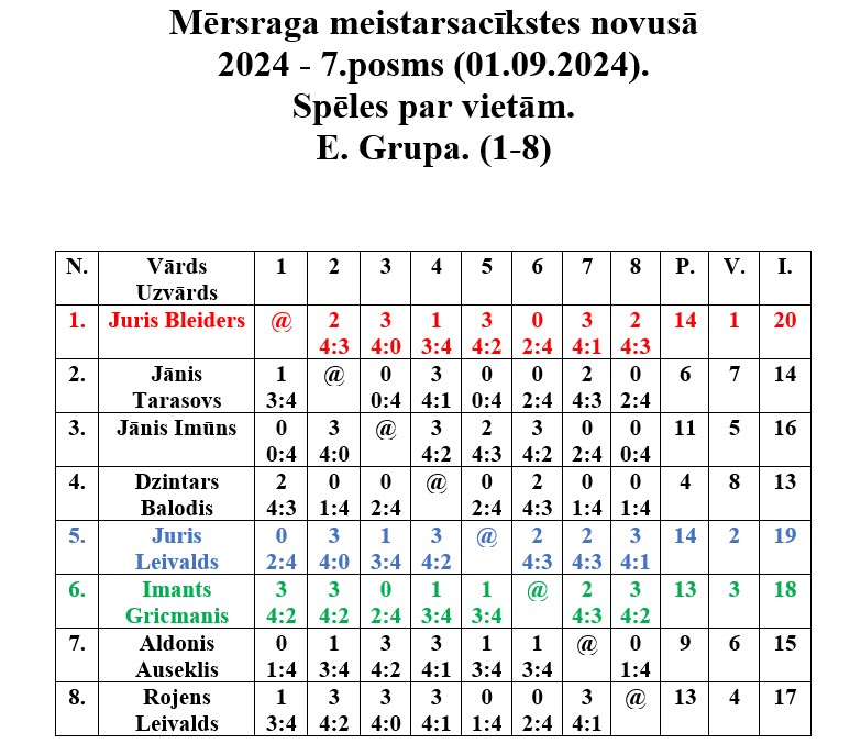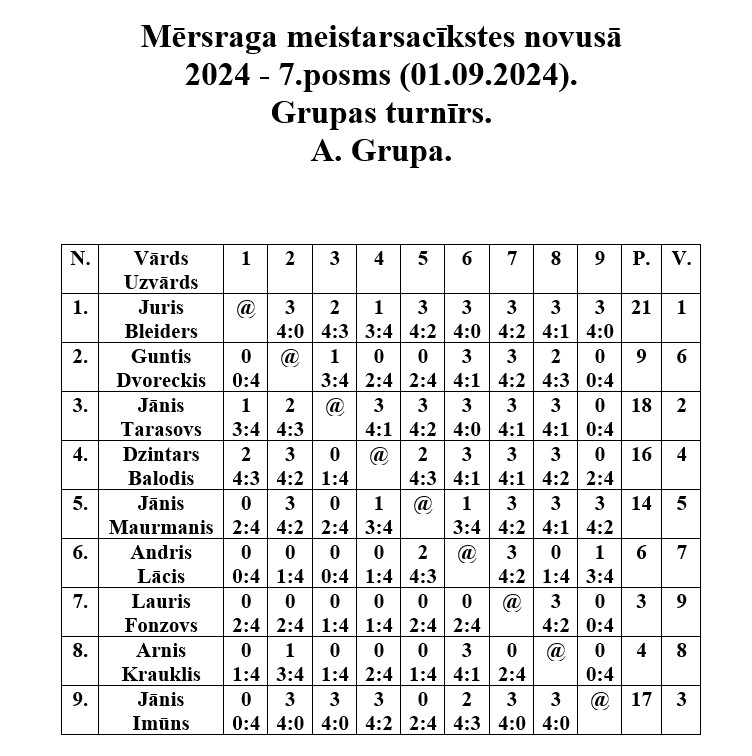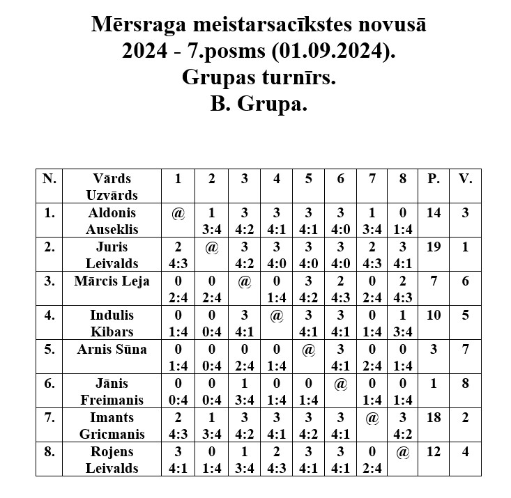 Pirmajā septembrī Mērsraga tautas namā notika Mērsraga meistarsacīkšu septītais posms novusā. Dalību septītajam posmam pieteica septiņpadsmit dalībnieki, no kuriem tika izveidotas divas grupas. Pēc grupas spēlēm notika spēles par vietām, kurās tika noskaidroti visu vietu ieguvēji. Pēc saspringtām un interesantām cīņām septītā posma uzvarētājs ir Juris Bleiders, otrajā vietā Juris Leivalds, bet trešais Imants Gricmanis.