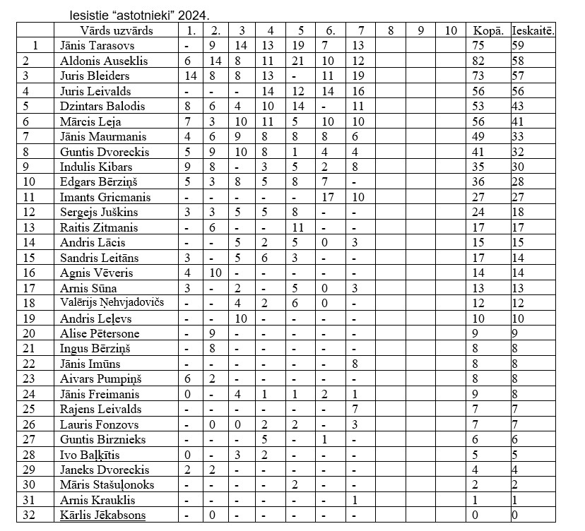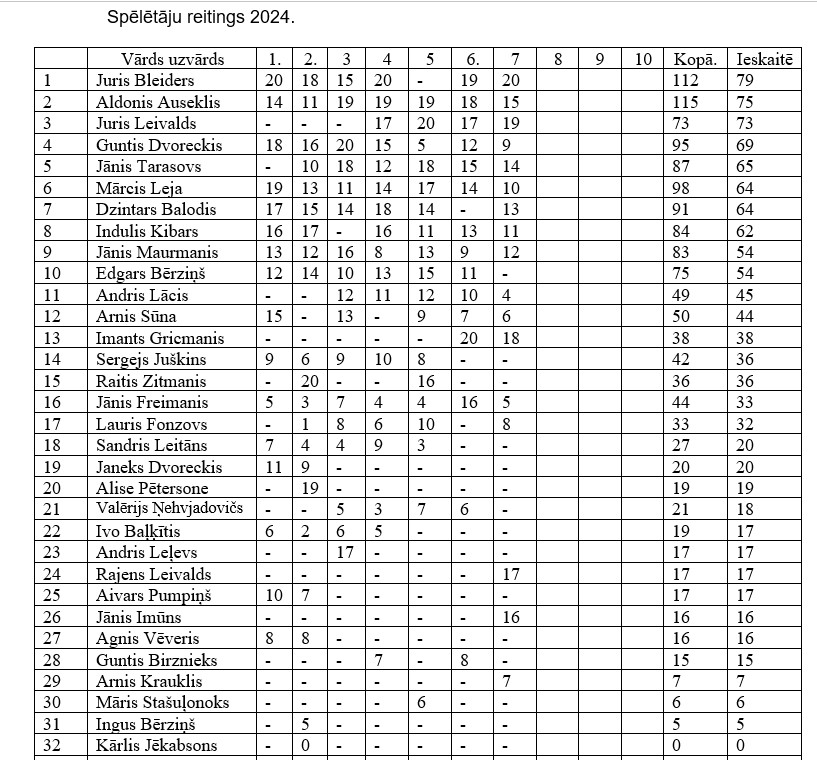 Kopvērtējumā pēc septiņiem posmiem pirmais Juris Bleiders, otrais Aldonis Auseklis, bet trešais Juris Leivalds.