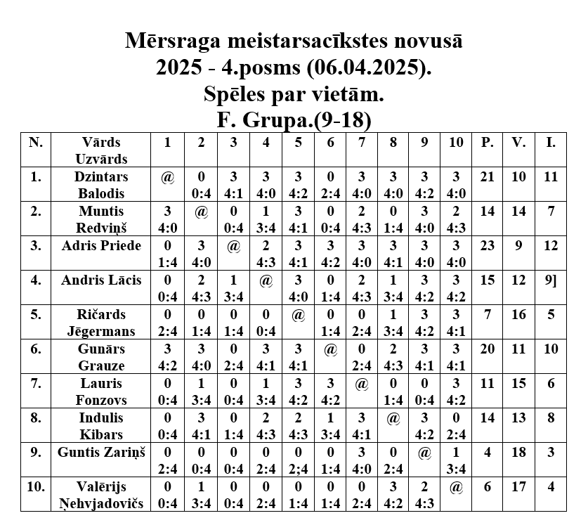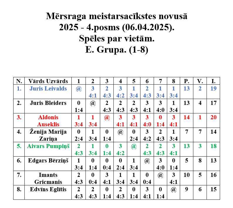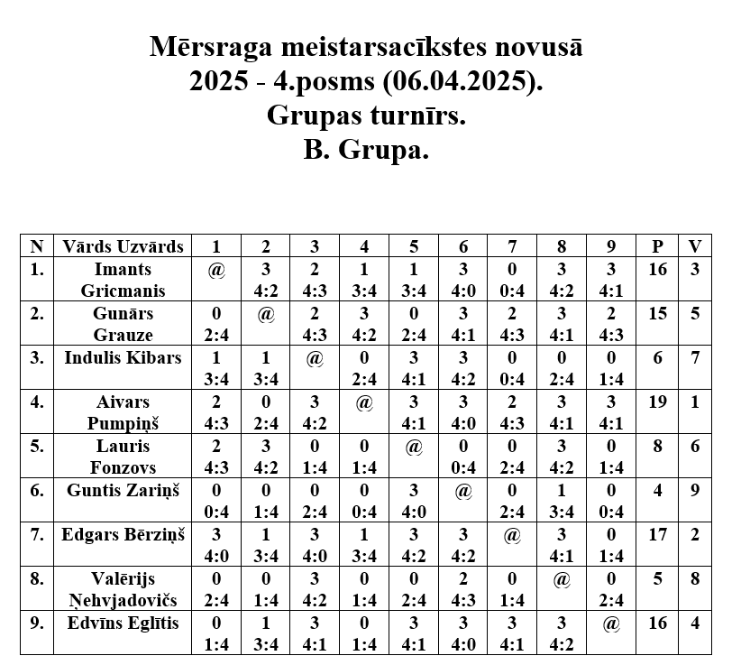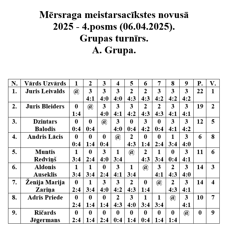 6. aprīlī Mērsraga tautas namā notika Mērsraga meistarsacīkšu ceturtais posms novusā. Dalību ceturtajam posmam pieteica astoņpadsmit dalībnieki, no kuriem tika izveidotas divas grupas. Pēc grupas spēlēm notika spēles par vietām, kurās tika noskaidroti visu vietu ieguvēji. Pēc saspringtām un interesantām cīņām ceturtā posma uzvarētājs ir Aldonis Auseklis, otrajā vietā Juris Leivalds, bet trešais Aivars Pumpiņš.