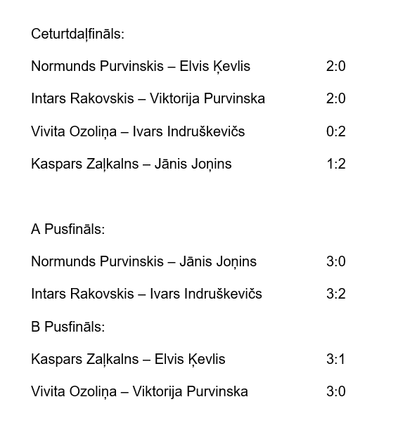Pusfinālā savā starpā tikās Ivars Indruškevičs un Intars Rakovskis, bet otrajā pārī – Jānis Joņins pret Normundu Purvinski. Veiksmīgāki un meistarīgāki izrādījās Normunds un Intars, kuri finālā noskaidroja uzvarētāju, bet par trešo vietu sacentās Ivars pret Jāni.