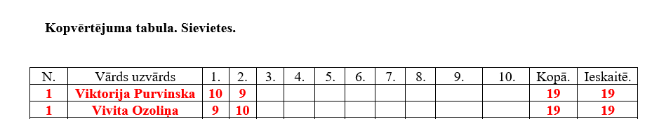 Sieviešu grupā pirmajā vietā Vivita Ozoliņa, otrā – Viktorija Purvinska.
