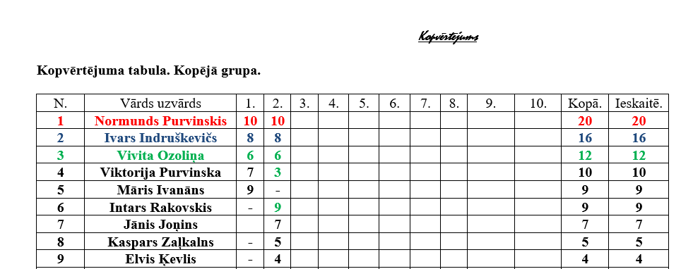 Kopvērtējumā pēc diviem posmiem kopējā grupā pirmais– Normunds Purvinskis ar 20 punktiem, otrais – Ivars Indruškevičs ar 16 punktiem, bet trešā – Vivita Ozoliņa ar 12 punktiem. Dāmu konkurencē pēc diviem posmiem ar 19 punktiem pirmo vietu dala Vivita Ozoliņa un Viktorija Purvinska.