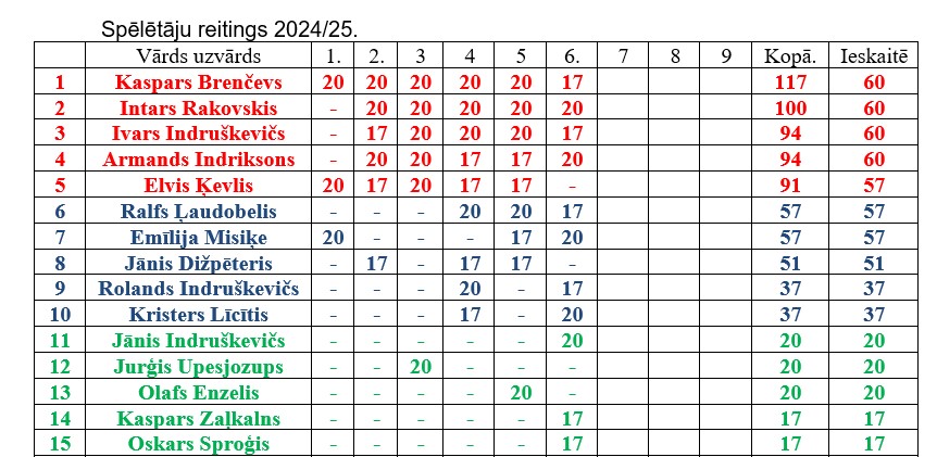 Kopvērtējumā reitingā pirmie pieci spēlētāji pēc sešiem posmiem ir Kaspars Brenčevs, Intars Rakovskis, Ivars Indruškevičs, Armands Indriksons un Elvis Ķevlis.