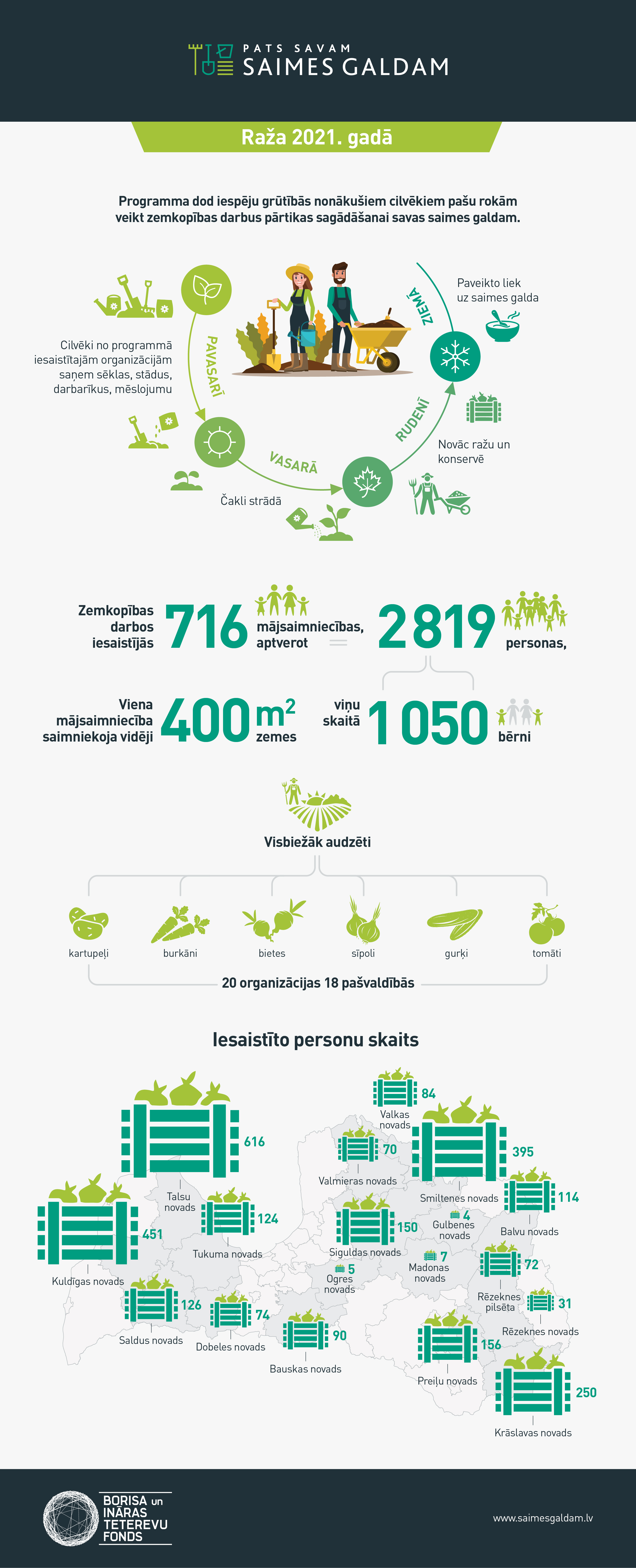 Pērn Borisa un Ināras Teterevu fonda atbalstu ieguva 20 bezpeļņas organizācijas. Tās īstenoja projektus, dārzkopības darbos iesaistot 700 mājsaimniecības 18 pašvaldībās Vidzemē, Latgalē, Kurzemē un Zemgalē.