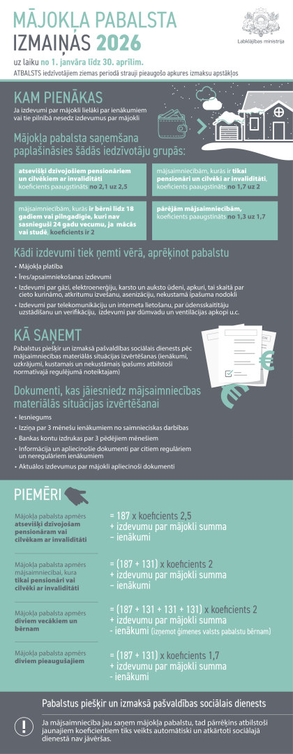 Izmaiņas paredz šīs ziemas periodā – no šā gada 1. janvāra līdz 30. aprīlim – palielināt koeficientus, pēc kuriem aprēķina mājokļa pabalstu.