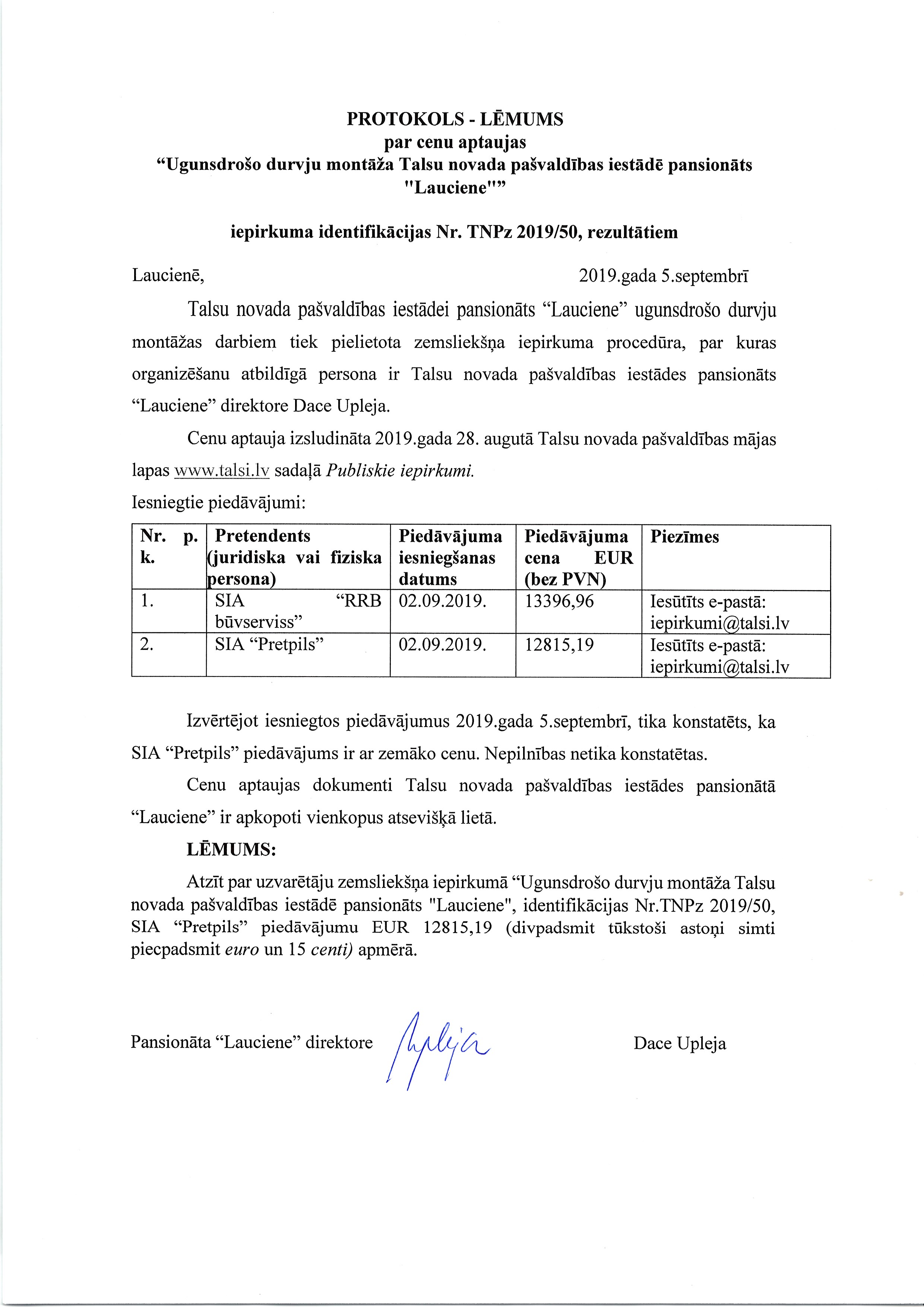 | Iepirkuma līguma nosaukums: | Ugunsdrošo durvju montāža Talsu novada pašvaldības iestādē pansionāts “Lauciene” |